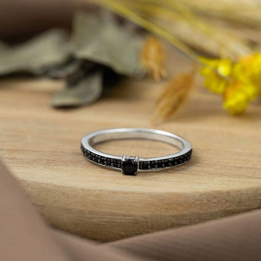 Anel Solitário Prata 925 Com Banho De Ródio Aro Zircônias Negras