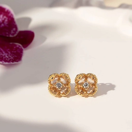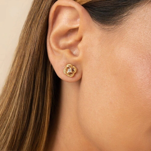 Brinco no Banho de Ouro 18k Flor Com Zircônia Champagne e Branca