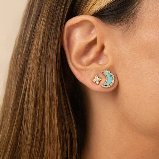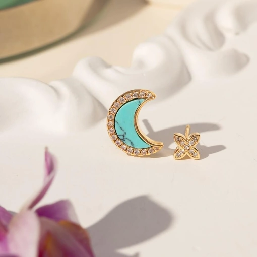 Brinco no Banho de Ouro 18k Lua Turquesa e Estrela Com Zircônias