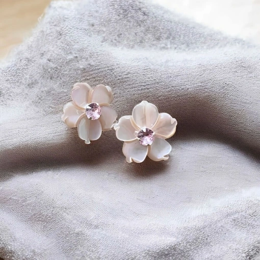 Brinco Prata 925 Flor Madrepérola Rosada Com Zircônia Rosa