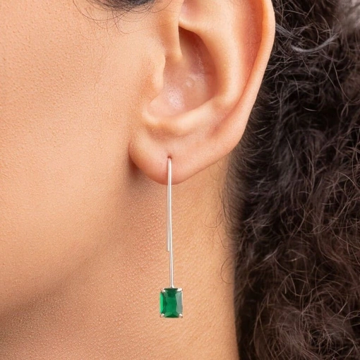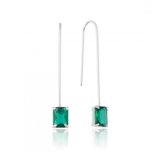 Brinco Prata 925 Fio Zircônia Retangular Cor Esmeralda