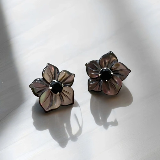Brinco Prata 925 Flor Abalone Com Zircônia Negra