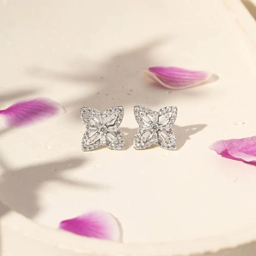 Brinco Prata 925 Com Banho de Ródio Flor Com Zircônias Brancas