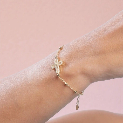 Pulseira Banhada a Ouro 18k Cruz Com Zircônia Branca e Bolinhas