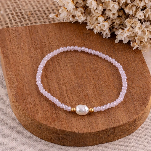 Pulseira Banhada A Ouro 18K Cristal Cor Lavanda e Pérola